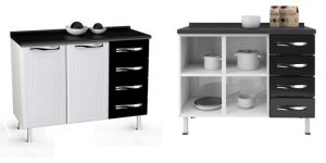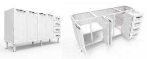 O gabinete é o módulo que fica embaixo da pia, por isso ele não possui tampo. A pia fica em cima da estrutura de ferro, porém é importante chumbar na parede e não no gabinete. Diferente do balcão, o gabinete tem um buraco para passagem do sifão da pia. O gabinete tem maior profundidade, é ideal para guardar objetos grandes: panela de pressão, travessas de vidro, bacias, tábuas de carne. Você precisa estar atento à altura, pois o gabinete tem 90 cm e a regulagem é feita para aumentar, mas nunca para diminuir a altura.