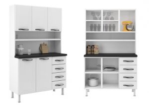Com o intuito de ajudar quem tem pouco espaço e muita coisa para organizar, este tipo de armário é ideal, pois ele é uma mistura de várias peças em um armário só. O kit de cozinha tem cristaleira onde dá para colocar os copos, taças e xícaras. Além disso, tem na parte de baixo o balcão para decoração e objetos de uso frequente. Possui gavetas e nichos com separados e espaço para utensílios mais altos.